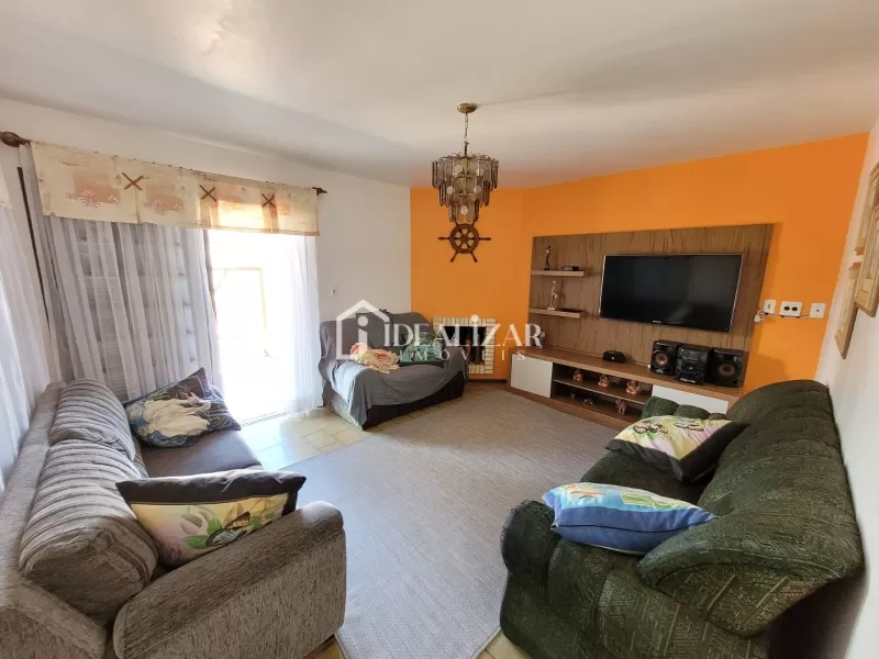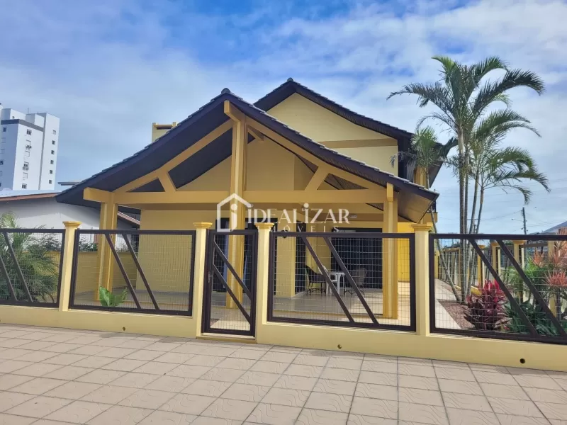 Sobrado de esquina em Areias Brancas apenas 480 metros do mar, na parte de baixo teria sala de estar e jantar em ambientes separados, cozinha, área de serviço, 1 banheiro social, garagem fechada para 2 carros, churrasqueira, na parte superior, tem 3 dormitórios sendo 1 suíte todos com sacada, 1 banheiros social, um total de 273 m² de área construída.