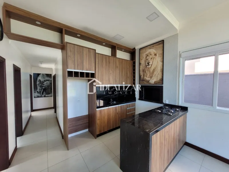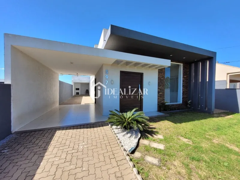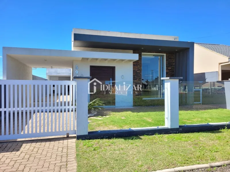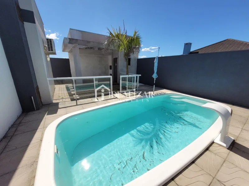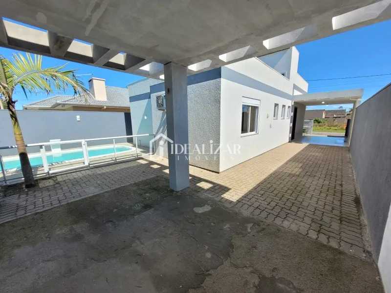 Bela casa na Praia de São Jorge, com pé direito duplo, com 114 m² de área construída, dispõe de 3 dormitórios sendo 1 suíte, sala de estar/jantar, cozinha, área de serviço, mais 1 banheiro social, churrasqueira, quiosque nos fundos com churrasqueira, 1 lavabo e piscina.