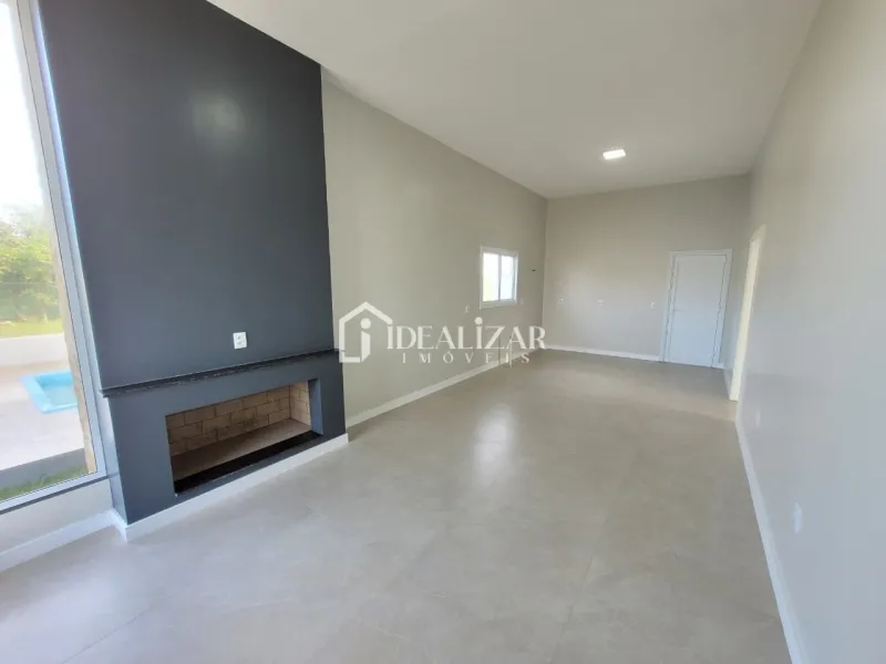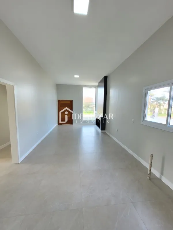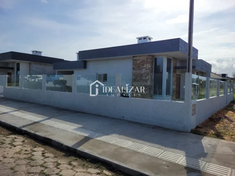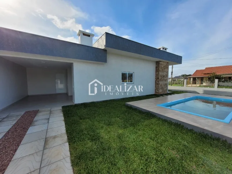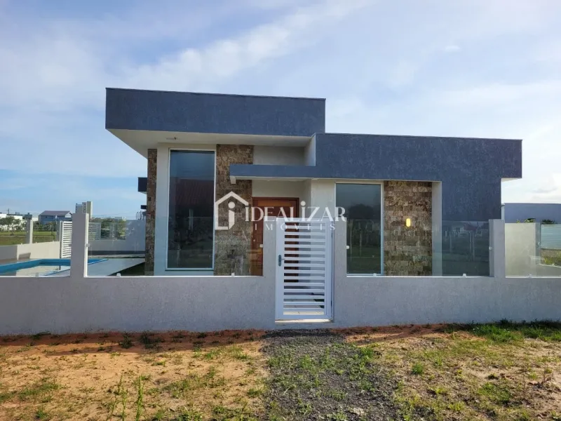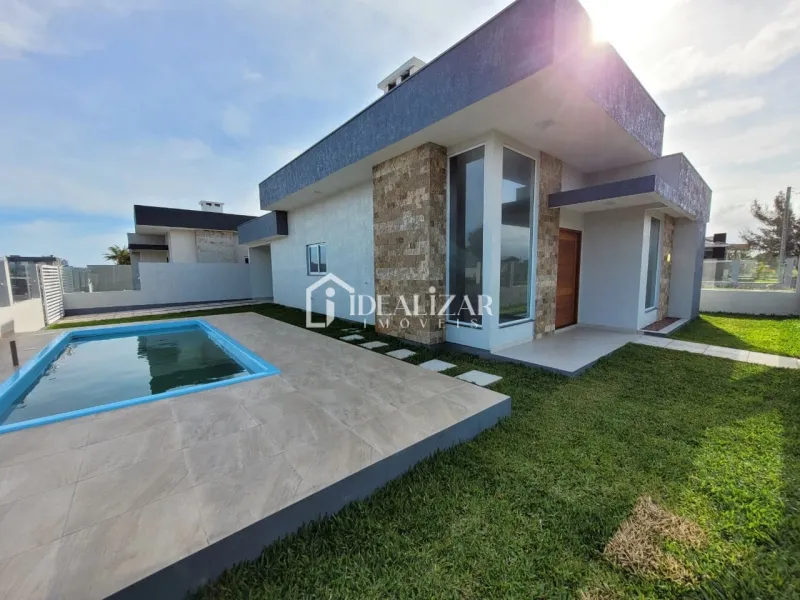 Casa com piscina, pé direito duplo, de esquina, apenas 350 metros do mar, dispõe de 3 dormitórios sendo 1 suíte, sala de estar/jantar, cozinha, área de serviço, 1 banheiro social, abrigo coberto para 1 carro, churrasqueira, lareira, 110 m² de área construída, terreno medindo 16 x 17,60, pátio fechado.